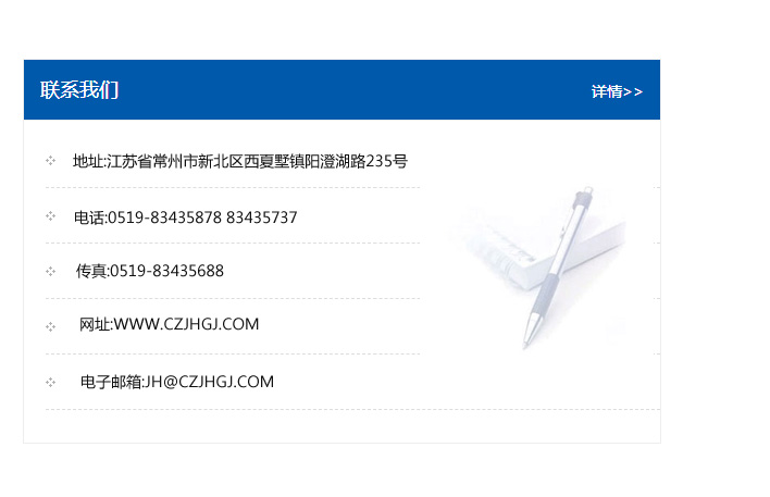 地址:常州市新北區友邦商務大廈1幢16、17層  電話:0519-85101652  傳真:0519-85112595  郵編:213022  網址:www_cz-jiayue_cn.zdsyxh.com  郵箱:xiajifengaa@163.com